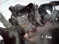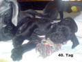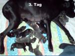 Neues von der WelpenstubeHeute sind unsere Babys schon 5 Tage bei uns. Nachdem die ersten Tage ziemlich angespannt waren, man will ja alles richtig machen, geht nun alles so allmählich in Routine über. Wir haben endlich Zeit, uns unsere Welpen einzeln unter die Lupe zu nehmen und Vergleiche zu ziehen, denn jedes sieht anders aus, aber alle sind gleich süß!!So stellten wir schon mal fest, dass alle Blauen das wunderschöne Stahlblau vom Exi haben ( kein Graublau ) und die Schwarzen richtig Lackschwarz glänzen, wie die Mama, die trotz der Geburtsanstrengungen, dem Säugen, verbunden mit Haarverlust durch die Hormonumstellung, nichts von ihrem Glanz verloren hat.Schon jetzt kann man beim Säugen, beim Zufüttern und beim Putzen einige Verhaltensunterschiede feststellen. Die einen sind ruhig und geduldig, während die anderen " schimpfen " können, wenn ihnen etwas nicht recht ist. Die einen gurren genüßlich, wenn sie Mama putzt, die anderen schreien, als wenn sie wasserscheu wären. Aber wenn es an die Milchbar geht, dann sind alle gleich, denn der Platz reicht trotz 10 Zitzen nicht für alle 11 auf einmal aus. Und da wird mächtig geschubst, draufgesprungen, und gerempelt. Am einfachsten hat es unser kleines blaues Mädel, welche nur 380 g Geburtsgewicht hatte und gestern am 4. Tag schon 555g wog! Sie ist so flink, dass sie ganz leise von unten an die Zitze krabbelt um diese dann blitzschnell zu erhaschen. Und das gelingt ihr immer. Wenn sie weiter so gut zunimmt, wird sie bald nicht mehr die Kleinste sein.Papa Excalibur ist nach wie vor der perfekte Ehemann. Besorgt steht er beim geringsten Winseln auf, um nach Mama und Kindern zu sehen. Er schläft neben dem Wurfbett auf einer großen Matratze. Für uns ist es selbstverständlich, dass auch wir im gleichen Raum schlafen, um immer helfen zu können, wenn Mama Verbeia uns braucht.Unsere Kleinen sind nun schon 8 Tage unter uns und sie entwickeln sich prächtig. Der Zitzenkrieg ist groß, aber wir haben Glück, unsere Verbeia hat 10 Stück davon. Bis jetzt müssen wir auch nur ein bischen zufüttern. Verbeias Milchbar ist ganz schnell wieder gefüllt. Sie ist und bleibt eine wunderbare Hündin. Wie konsequent sie ihre Kleinen putzt, liebkost und auch satt bekommt. Ihre Züchter Elke und Lothar sagen, das hat sie von ihrer Mama Quasa von Wotans Meute geerbt. Na und nun hoffen wir, das sie diese wunderbaren Gene an ihre Kids weiter gibt.Und nun noch etwas ganz Erfreuliches: Alle Welpen sollten lt. Faustregel am 10.Tag ihr Geburtsgewicht verdoppelt haben.... unser kleinstes Liebling hat das heute schon erreicht!!!! Wir freuen uns riesig!!! 380g Geburtsgewicht und heute hat sie schon 760g!!! Gestern waren unsere Zuckersüßen 10 Tage alt und wie versprochen, könnt Ihr hier die Gewichte einsehen:Dazu sollt ihr wissen, dass wir geschworen haben, dass der erstgeborene Rüde den Namen unserer unvergessenen 1. Deutschen Dogge " Alex " erhält und die erstgeborene Hündin von unserer 1. Hündin unserer Familie " Arsina " !Besonders sind wir stolz über unser kleines blaues Mädel mit gelbem Band. Sie hat schon 235% vom Geburtsgewicht erreicht. Sie ist flink, sehr munter und " boxt " sich gegen die Großen durch, wenn es an die Milchbar geht.Jetzt haben die Kleinen bemerkt, dass man die Beinchen auch auch gebrauchen kann und versuchen zu laufen, zu rennen oder zu hopsen wie ein Hase. Man kann sich nicht satt sehen, so goldig sind sie.Unsere Mama verläßt nun auch ab und zu die Wurfkiste und wenn sie mit Uwe Gassi geht, schaut sie mir noch einmal in die Augen, wartet kurz und geht dann vertrauesnsvoll mit.Heute Nacht wurden wir durch etwas Feuchte im Gesicht geweckt. Mama Verbeia kam zu uns, schleckte kurz über unser Gesicht und legte sich wieder zu ihren Babys hin. Das war so unbeschreiblich schön, als ob sie uns “Danke” sagen will.Jetzt sind unsere kleinen Zwerge schon 16 Tage alt. Sie sind bereits das 1. Mal entwurmt, bekamen Mama Verbeia zu liebe die scharfen Krallen gekürzt und haben alle samt die Äuglein auf.Langsam versuchen alle aus der Wurfkiste zu krabbeln, wenn sie uns draußen spüren. Wir brauchen uns nur über den Rand beugen und schon sind sie alle an unseren Armen und quieken, schmatzen oder kuscheln sich ran. Es sind unbeschreibliche, wundervolle Gefühle. Man darf gar nicht an den Tag denken, wo man sie abgeben muß. Am Liebsten würden wir sie alle selber behalten... unsere Babys.