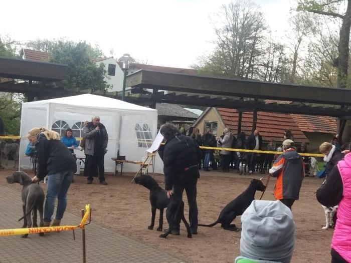 copyright Deutsche Doggen von Betz’ens Meute 2017BabyklasseAm 23.04.2017 hatte ich meine erste VDH/DDC Ausstellung.So viele fremde Menschen und Hunde hatte ich bisher nochnicht gesehen, aber es war alles cool.Emma hat heute gewonnen und ich habe den 2. Platz.Tagesform entscheidet und es bleibt doch in der Familie.Das Beste war, dass ich meine Geschwister Enyo, Emma undmeine Halbgeschwister Domina und Devil wieder gesehen habe.