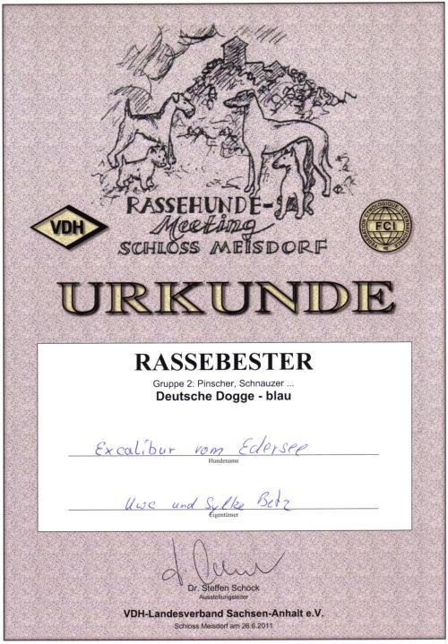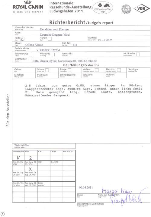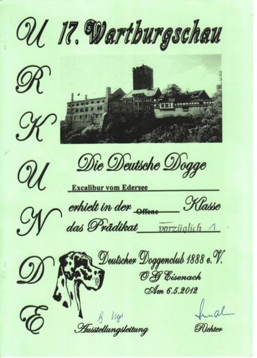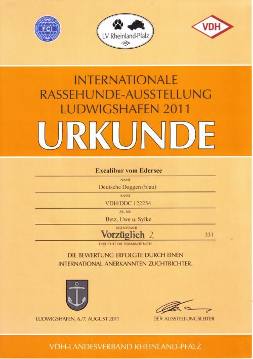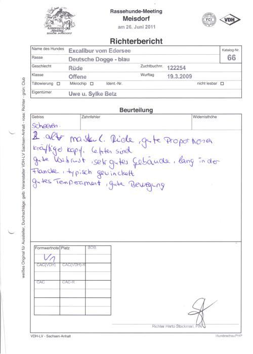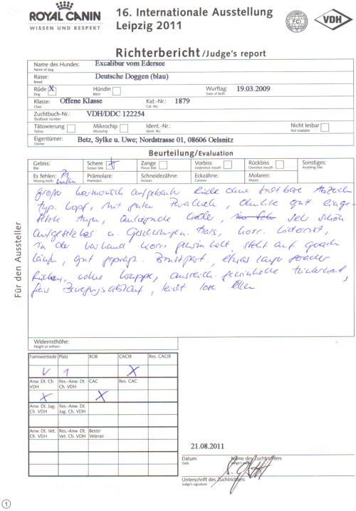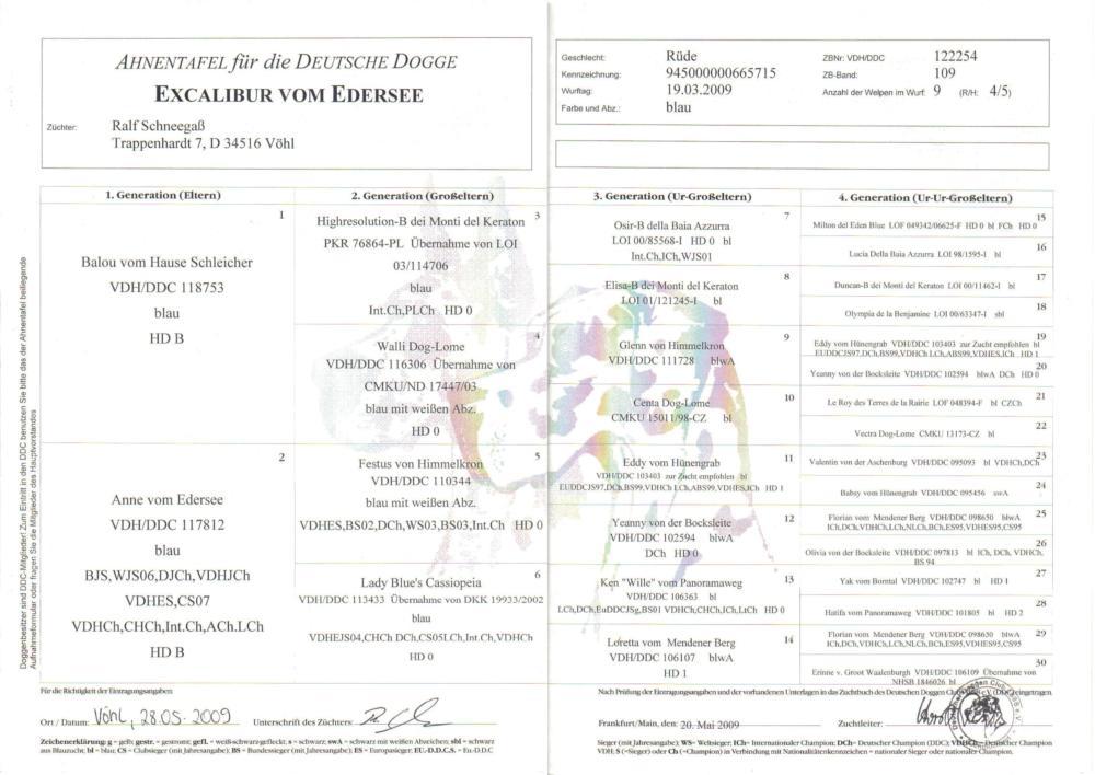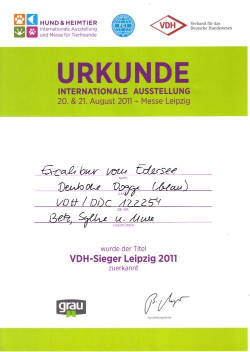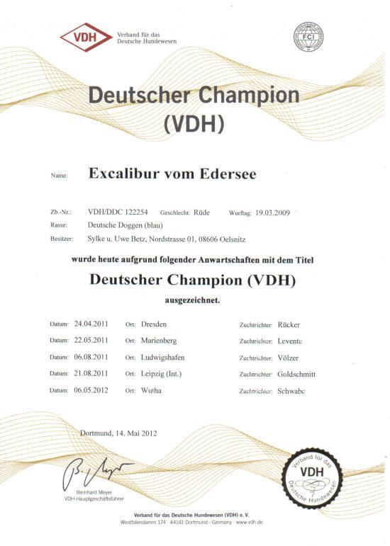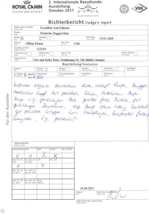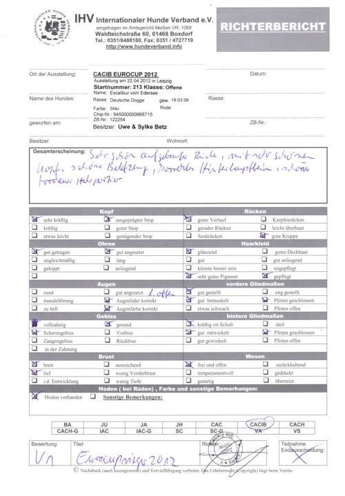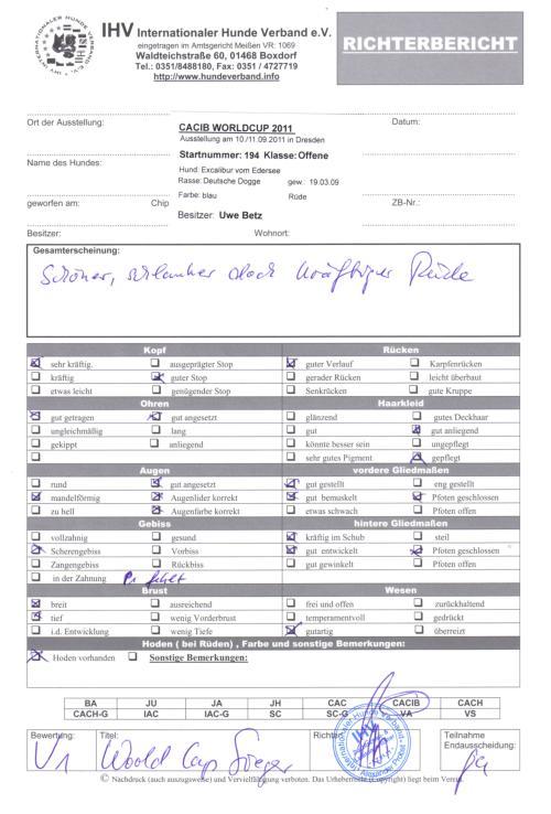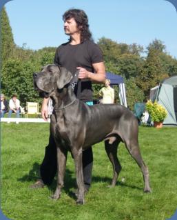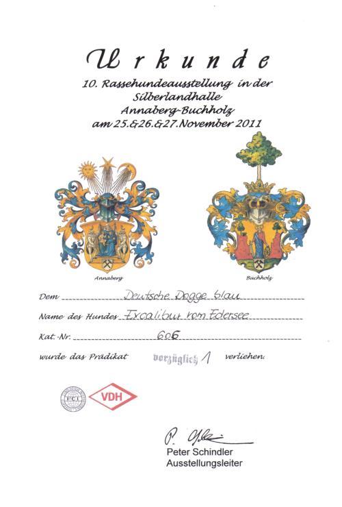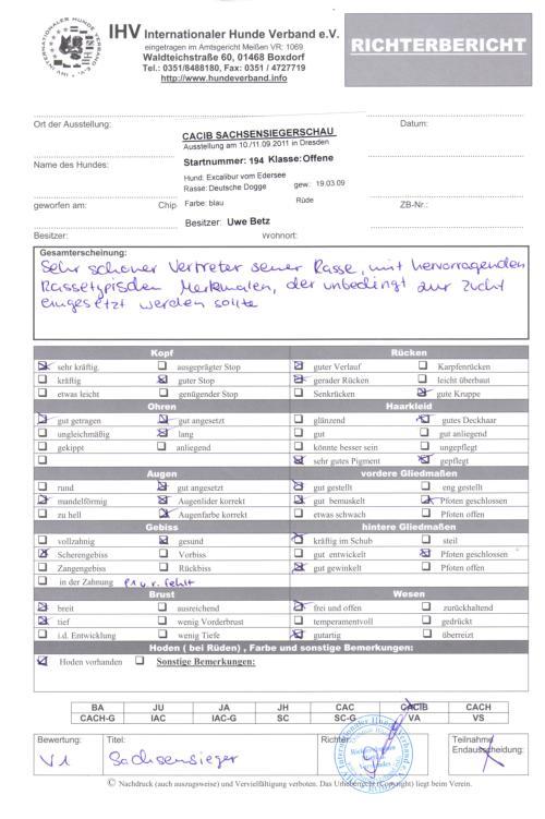 copyright Deutsche Doggen von Betz’ens MeuteDas bin ich: Excalibur vom Edersee.... wenn ich lieb bin, bin ich EXI und das bin ich fast immer !!Am 19.03.2009 schenkte mir meine Mama, die Anne vom Edersee, mein wundervolles Leben.Mein Doggenpapa ist Balou vom Hause Schleicher, dessen Vater der Festus von Himmelkron ist.Meine lieben Züchter, Yvonne Fischer und Ralf Schneegaß haben alles dafür getan, dass meinen Geschwistern und mir nichts an Liebe, Geborgenheit und Gesundheit fehlte. Ich danke Ihnen dafür mit meinem wunderbaren Wesen und verspreche ihnen, dass ich dies an meine Kinder weitergeben werde.Eines Tages, Anfang Juni, es war ein verregneter Tag, kam ein Ehepaar zu uns nach Hause. Meine ganze Doggenfamilie, Oma, Mama, Tanten und meine Geschwister, rannten gleich auf die Zwei los und beschnupperten sie. Aber diese 2 Menschen hatten überhaupt keine Angst vor uns, sie bestaunten uns, knieten sich zu uns streichelten uns alle, sodass wir sie gleich zu uns auf den Hof mit nahmen. Und dann sagten sie, dass sie mich unbedingt gleich mitnehmen wollen. Es war Liebe auf den 1. Blick.Ich durfte mich mit meiner neuen Mutti im Auto auf die Rückbank, auf eine ganz weiche Kuscheldecke, setzen, und genoss ihre Streicheleinheiten. Immer wieder sahen wir uns liebevoll in die Augen ... bis ich im Auto einschlief.Zu Hause angekommen, erwartete uns schon die ganze Familie. Alle bestaunten mich, weil ich so eine schöne Farbe und ein samtweiches Fell hatte. Ich wusste gleich, dass ich hier der King der Familie bin und meine Mutti und Papa megastolz sind.Ich zeigte ihnen gleich, dass ich eine gute Kinderstube hatte. Ich war sofort stubenrein, war lieb, und konnte schon „ Vorsitz „ machen, wenn es Leckerlie gab.HA erlegt!Ich lernte sehr schnell, sodass wir auch schon bald zum Hundeplatz gingen. Dort zeigte ich stolz alles, was ich schon konnte. Nur einmal war es lustig. Ich mußte mit Mutti auf den Platz und sollte an einer riesenlangen Schleppleine zeigen, dass ich mich auf sie konzentriere und immer ihr folge. Aber die Leine war doch viel interessanter, sowas kannte ich nicht und als sich Mutti dann darin verfing, wurde es noch lustiger und ich wollte mit ihr richtig spielen. Naja, dann machte Papa die Leine ab und wir zeigten, dass wir die Übungen doch schon ohne diese Leine drauf haben.Papa und ich besuchten sehr viele Ausstellungen. 2011 habe ich sogar 12 mal gewonnen. Einmal war ich sogar in den Richter verliebt. Naja, er hat nur gelacht, als ich, wie er auf zwei Beinen, ihn umarmen wollte. Warum hat er da gelacht? Mutti und Papa umarmen sich doch auch so ??Das Allerschönste in meinem bisherigen Leben war, als eines Tages ein niedliches,lackschwarzes Doggenmädel bei uns einzog. War ich da vielleicht aufgeregt!! Ich konnte meine Fellnase gar nicht von ihr lassen. Bald merkte ich, dass ihr lautstarkes „Michattackieren“ nur Spaß und Spiel ist. Wir spielen, fressen und kuscheln immer zusammen. Letzteres am Liebsten mit Mutti und Papa auf 2 riesengrossen Matratzen vor dem Fernseher. Verbeia liegt dabei wie ein Baby in Papas Arm und schaut fern und ich liege am Liebsten bei Mutti und schlummere vor mich hin. Ich kann gar nicht verstehen, weshalb ich 2 Mal im Jahr einige Tage nicht mit Verbeia zusammen sein darf. Da muss ich immer ein wenig weinen!Ich liebe unsere stundenlangen Spaziergänge mit richtigem Austoben. Freue mich riesig, wenn die ganzen Enkel-Kids da sind und mit uns auf der Matratze kuscheln. Sitze zu gerne bei meinen Eltern auf dem Schoß! Warum beim Tierarzt im Wartezimmer da einige lachen, frag ich mich??Und ganz besonders freue ich mich, wenn wir kleine Artgenossen unterwegs treffen. Ich muß mich da immer klitzeklein machen, damit ich ihnen in die Augen sehen kann, das ist richtig toll!!Aber wer meine Eltern nicht mag, den mag ich auch nicht! Ich sag ihnen das und bin ganz lieb!Name:Excalibur vom EderseeWurftag:19.03.2009Farbe:stahlblauGröße:92cm WiderristVater:Balou vom Hause SchleicherMutter:Anne vom EderseeZuchtzul.:13.07.2013 Endgültig