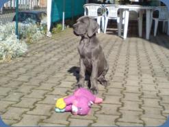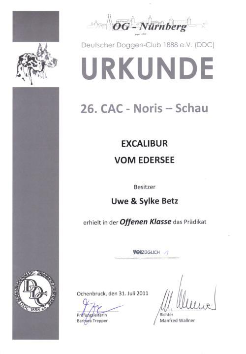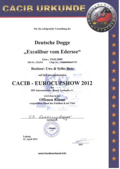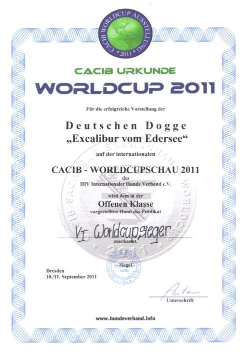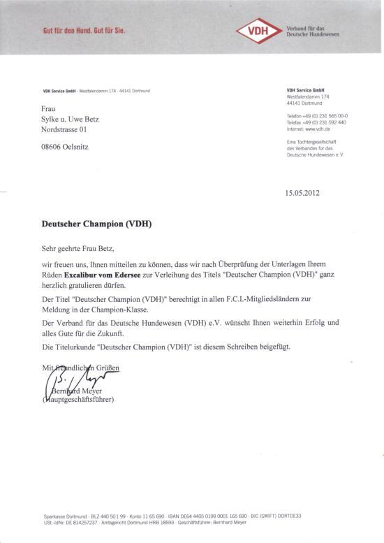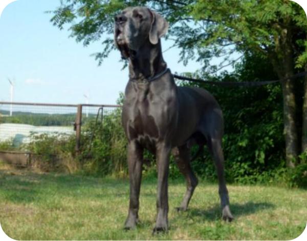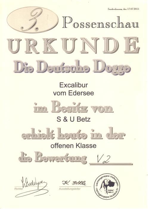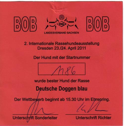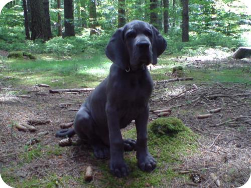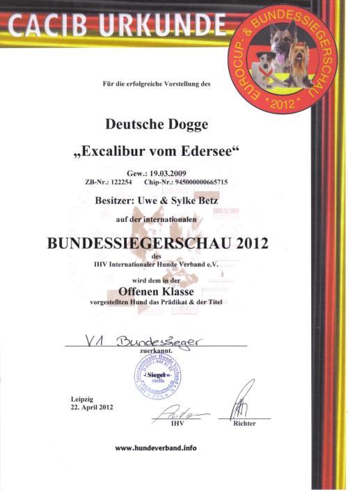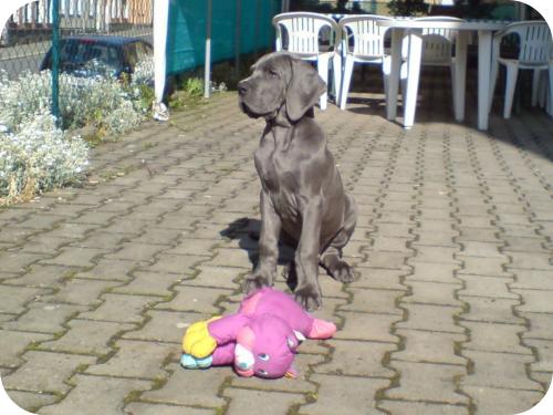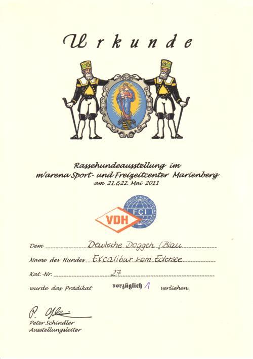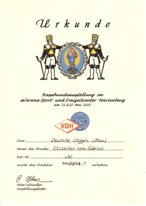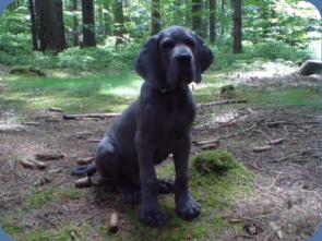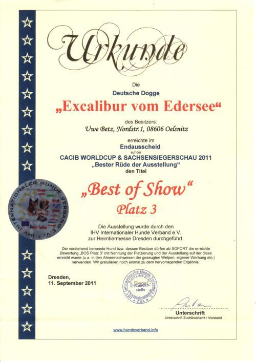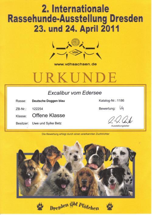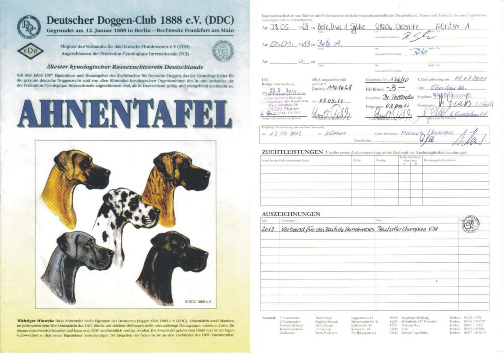 copyright Deutsche Doggen von Betz’ens MeuteDas bin ich: Excalibur vom Edersee.... wenn ich lieb bin, bin ich EXI und das bin ich fast immer !!Am 19.03.2009 schenkte mir meine Mama, die Anne vom Edersee, mein wundervolles Leben.Mein Doggenpapa ist Balou vom Hause Schleicher, dessen Vater der Festus von Himmelkron ist.Meine lieben Züchter, Yvonne Fischer und Ralf Schneegaß haben alles dafür getan, dass meinen Geschwistern und mir nichts an Liebe, Geborgenheit und Gesundheit fehlte. Ich danke Ihnen dafür mit meinem wunderbaren Wesen und verspreche ihnen, dass ich dies an meine Kinder weitergeben werde.Eines Tages, Anfang Juni, es war ein verregneter Tag, kam ein Ehepaar zu uns nach Hause. Meine ganze Doggenfamilie, Oma, Mama, Tanten und meine Geschwister, rannten gleich auf die Zwei los und beschnupperten sie. Aber diese 2 Menschen hatten überhaupt keine Angst vor uns, sie bestaunten uns, knieten sich zu uns streichelten uns alle, sodass wir sie gleich zu uns auf den Hof mit nahmen. Und dann sagten sie, dass sie mich unbedingt gleich mitnehmen wollen. Es war Liebe auf den 1. Blick.Ich durfte mich mit meiner neuen Mutti im Auto auf die Rückbank, auf eine ganz weiche Kuscheldecke, setzen, und genoss ihre Streicheleinheiten. Immer wieder sahen wir uns liebevoll in die Augen ... bis ich im Auto einschlief.Zu Hause angekommen, erwartete uns schon die ganze Familie. Alle bestaunten mich, weil ich so eine schöne Farbe und ein samtweiches Fell hatte. Ich wusste gleich, dass ich hier der King der Familie bin und meine Mutti und Papa megastolz sind.Ich zeigte ihnen gleich, dass ich eine gute Kinderstube hatte. Ich war sofort stubenrein, war lieb, und konnte schon „ Vorsitz „ machen, wenn es Leckerlie gab.HA erlegt!Ich lernte sehr schnell, sodass wir auch schon bald zum Hundeplatz gingen. Dort zeigte ich stolz alles, was ich schon konnte. Nur einmal war es lustig. Ich mußte mit Mutti auf den Platz und sollte an einer riesenlangen Schleppleine zeigen, dass ich mich auf sie konzentriere und immer ihr folge. Aber die Leine war doch viel interessanter, sowas kannte ich nicht und als sich Mutti dann darin verfing, wurde es noch lustiger und ich wollte mit ihr richtig spielen. Naja, dann machte Papa die Leine ab und wir zeigten, dass wir die Übungen doch schon ohne diese Leine drauf haben.Papa und ich besuchten sehr viele Ausstellungen. 2011 habe ich sogar 12 mal gewonnen. Einmal war ich sogar in den Richter verliebt. Naja, er hat nur gelacht, als ich, wie er auf zwei Beinen, ihn umarmen wollte. Warum hat er da gelacht? Mutti und Papa umarmen sich doch auch so ??Das Allerschönste in meinem bisherigen Leben war, als eines Tages ein niedliches,lackschwarzes Doggenmädel bei uns einzog. War ich da vielleicht aufgeregt!! Ich konnte meine Fellnase gar nicht von ihr lassen. Bald merkte ich, dass ihr lautstarkes „Michattackieren“ nur Spaß und Spiel ist. Wir spielen, fressen und kuscheln immer zusammen. Letzteres am Liebsten mit Mutti und Papa auf 2 riesengrossen Matratzen vor dem Fernseher. Verbeia liegt dabei wie ein Baby in Papas Arm und schaut fern und ich liege am Liebsten bei Mutti und schlummere vor mich hin. Ich kann gar nicht verstehen, weshalb ich 2 Mal im Jahr einige Tage nicht mit Verbeia zusammen sein darf. Da muss ich immer ein wenig weinen!Ich liebe unsere stundenlangen Spaziergänge mit richtigem Austoben. Freue mich riesig, wenn die ganzen Enkel-Kids da sind und mit uns auf der Matratze kuscheln. Sitze zu gerne bei meinen Eltern auf dem Schoß! Warum beim Tierarzt im Wartezimmer da einige lachen, frag ich mich??Und ganz besonders freue ich mich, wenn wir kleine Artgenossen unterwegs treffen. Ich muß mich da immer klitzeklein machen, damit ich ihnen in die Augen sehen kann, das ist richtig toll!!Aber wer meine Eltern nicht mag, den mag ich auch nicht! Ich sag ihnen das und bin ganz lieb!Name:Excalibur vom EderseeWurftag:19.03.2009Farbe:stahlblauGröße:92cm WiderristVater:Balou vom Hause SchleicherMutter:Anne vom EderseeZuchtzul.:13.07.2013 Endgültig